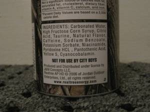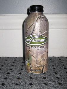 Team Realtree Outdoor energy drink. A camouflaged, sugar-packed, carbonated energy drink custom packaged for hunters (so not to “scare away the critters”). I have included photos of the front and the back not only so you can fully admire the camo, but so you can also read the ingredients and, more importantly, the tag line.