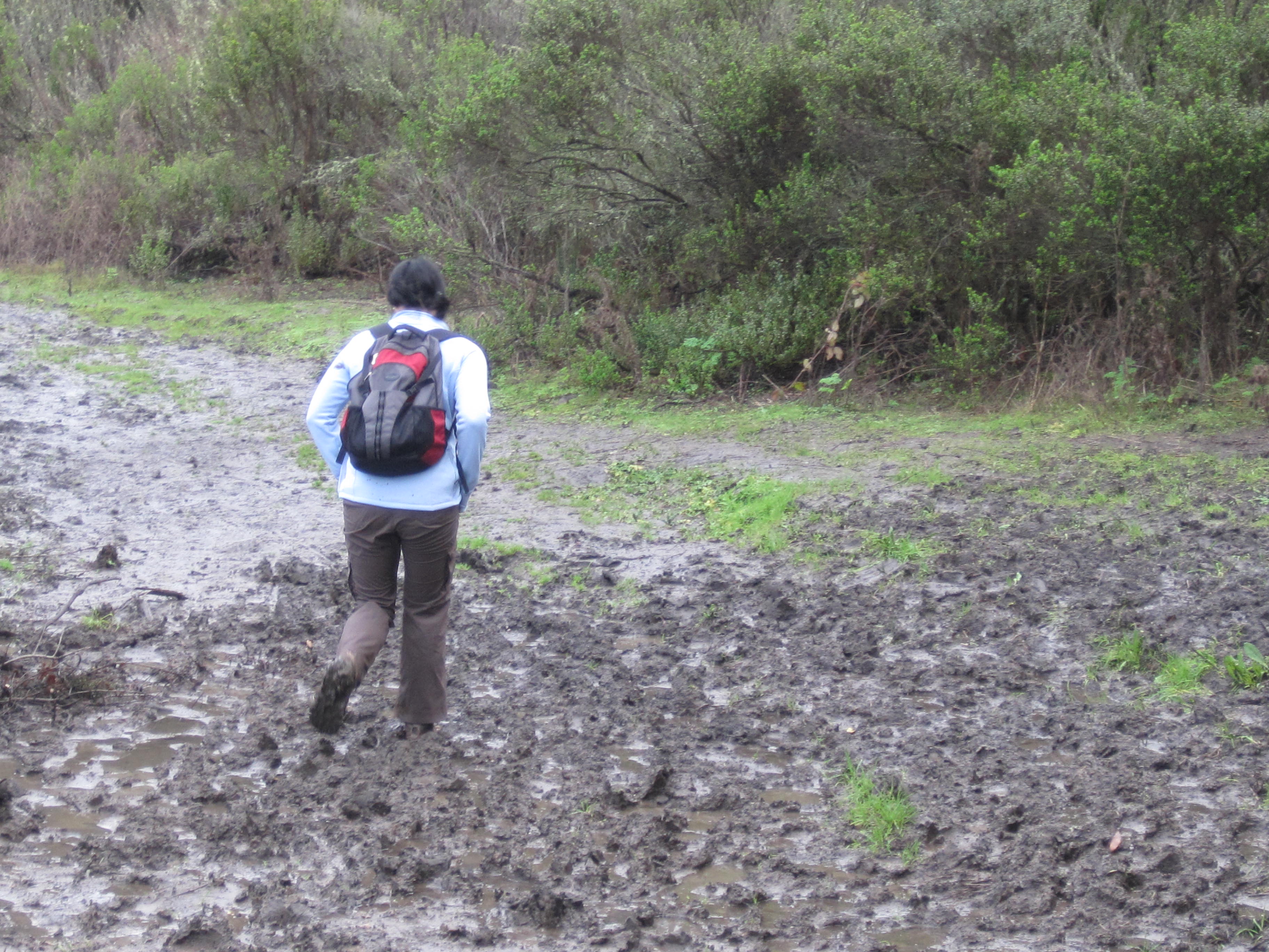 The early part of this hike was nothing to write home about…trails were muddy (but we’re pros at that), kind of hilly, some views of San Quentin and the north bay. The instructions also mentioned that “there are many informal trails cut into the hillside, and it is often a confounding proposition to stay on the real trail.” Troublesome considering our history.