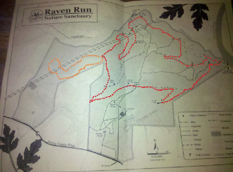 The “run” part of my grand plan hit a small road bump this past week…shin splints.   Damn.  So instead I have been swimming, spinning…and hiking!  The weather here has been beautiful, and this past Saturday (when I would normally do my long run) it was 85 and clear and gorgeous, and I was bummed that I couldn’t run.  So I decided to take a drive through the horse farms and hit up Raven Run, a local hike.  I chose Raven Run namely because Paul assured me that the trails are wide and clear and well marked and there are families everywhere, so I wouldn’t get attacked or lost if I went alone.