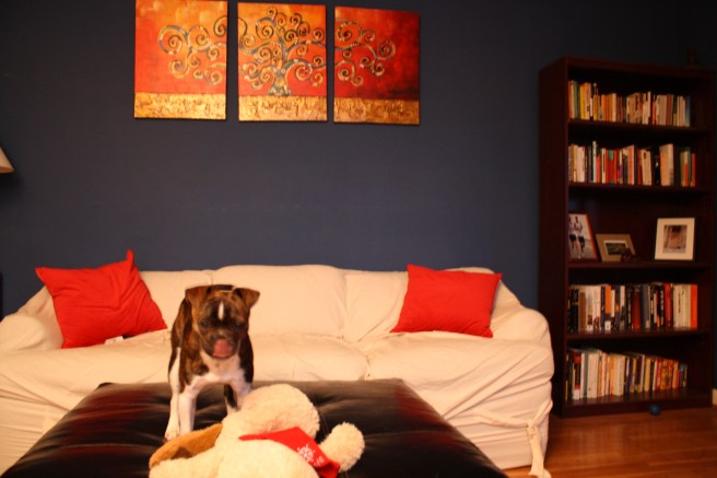 All of the walls in our house are kind of a brownish-gray color, except for the biggest room, the living room, which is dark blue.  Wildcat blue.