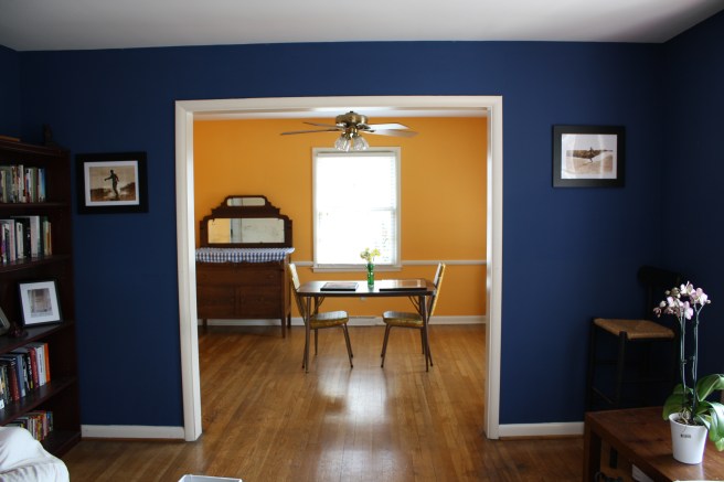 We are not repainting the blue room.  Too much work.  Which means we are going to have to work with the blue…starting with the dining room.  The dining room opens up into the living room, so our goal was twofold: find a color that brightened up the dining room (inside the house can get a little dark) and also went well with the blue.