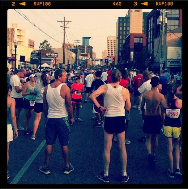 I absolutely love love love this race.  To me, it embodies the all of the good things about living in small-town America.  Most of the run is through downtown and on one main tree-lined road.  Everybody and their mother is out, either running or hungover on the side of the road supporting somebody.  The entire course is lined with people cheering and little kids holding signs and the owners of the houses along the route hosing you down.  There is a band at mile 4 wearing boating hats and that plays When the Saints Go Marching In.  Everyone is in a good mood.  Every time I run this I feel like I’m in a movie.