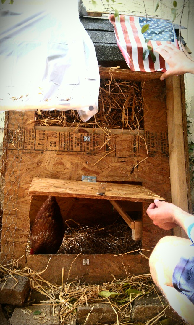 We considered putting a net under the high perch to catch the egg, but I had images of a chicken trying to jump up to the perch and getting caught in the net and finding a strangled chicken dangling one morning. No go.
