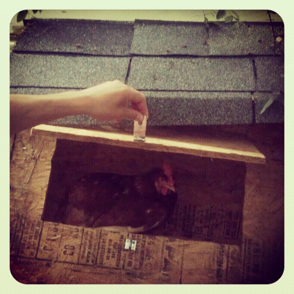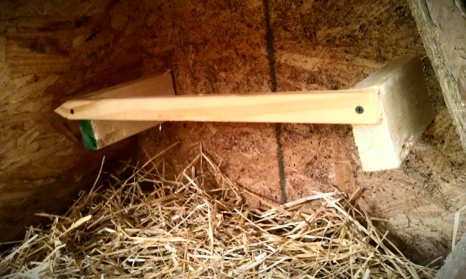 This weekend we nailed a piece of plywood over the top perch, completely blocking off the second level, and filled the above cavity with straw, simultaneously preventing anyone from laying off the top perch AND providing additional insulation for winter. Boom.