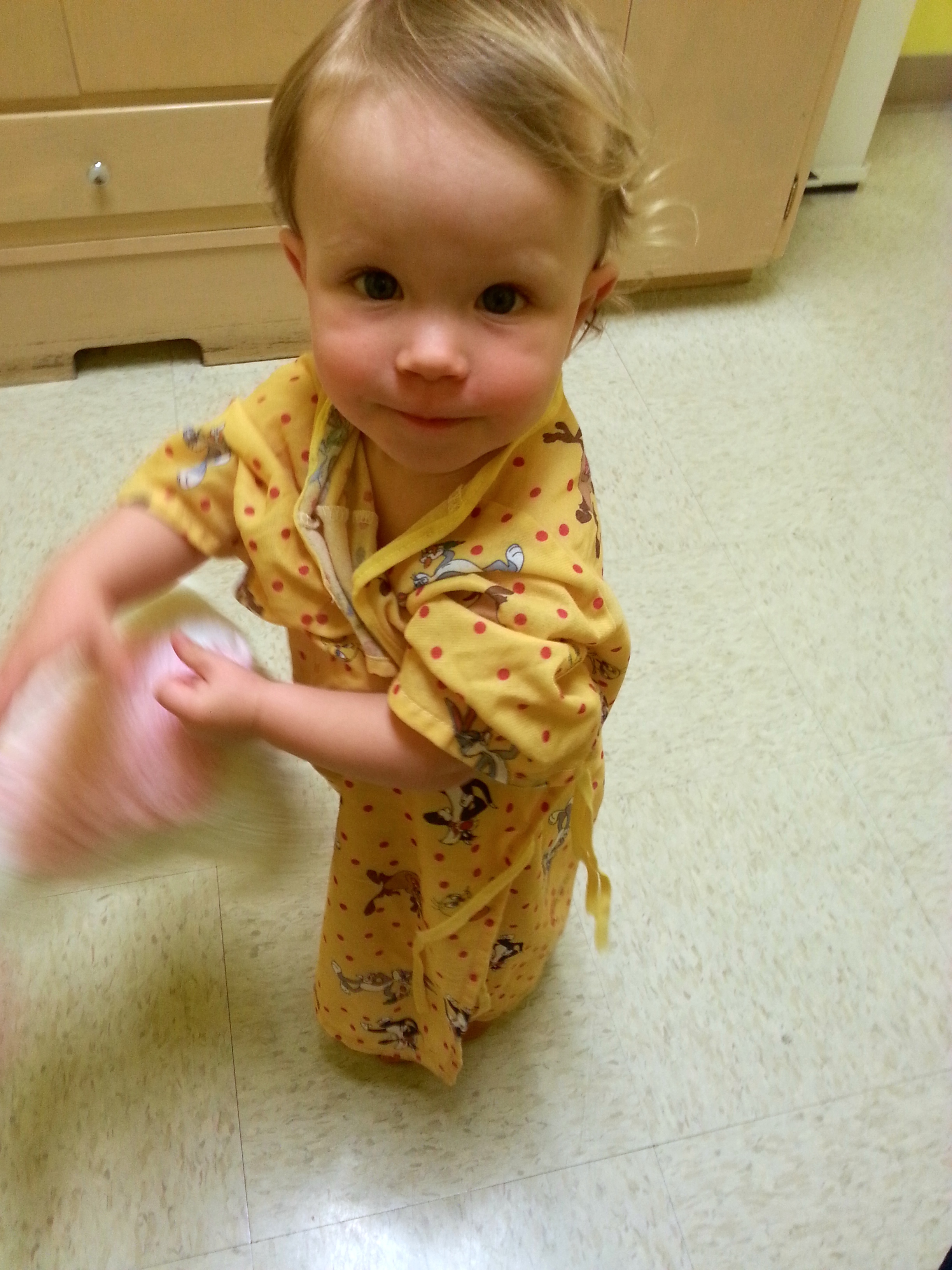And since I don’t have a picture of our tasmanian devil in her costume yet, here she is at the doctor’s office in a Looney Tunes gown that looks like a kimono.