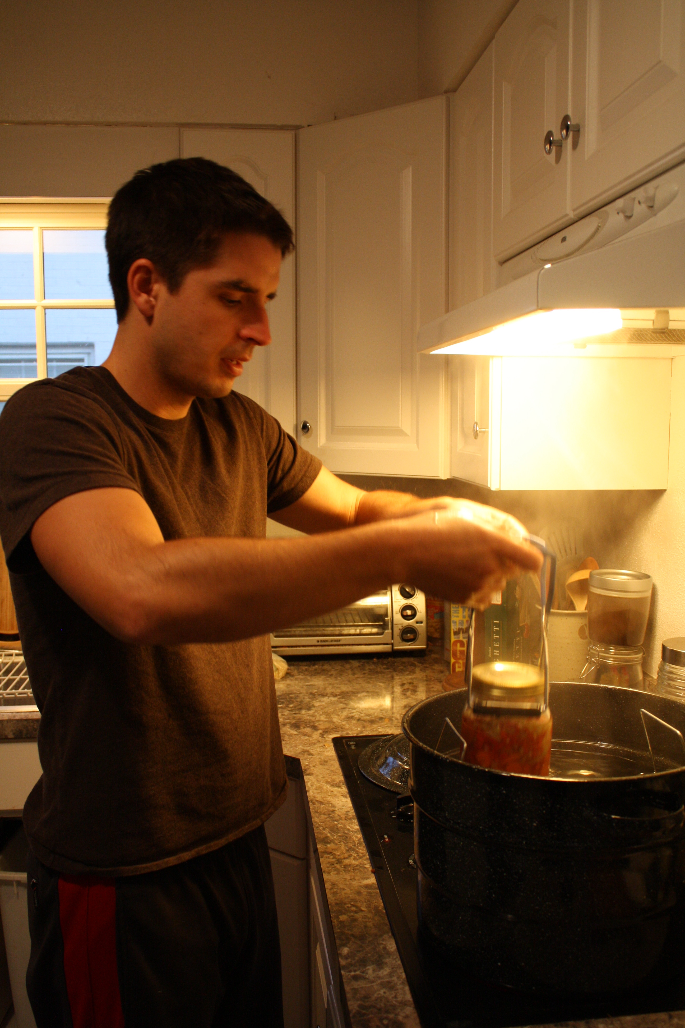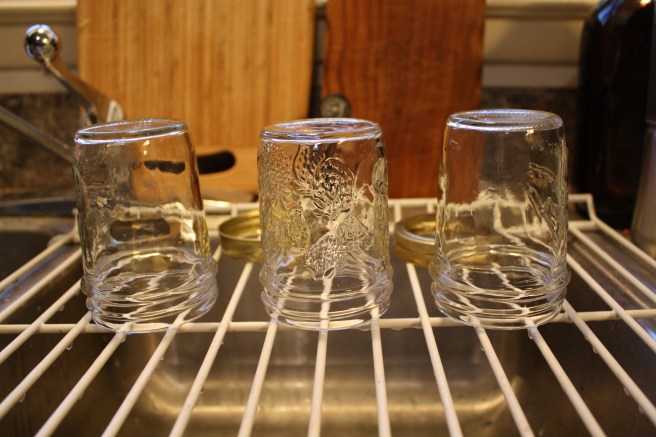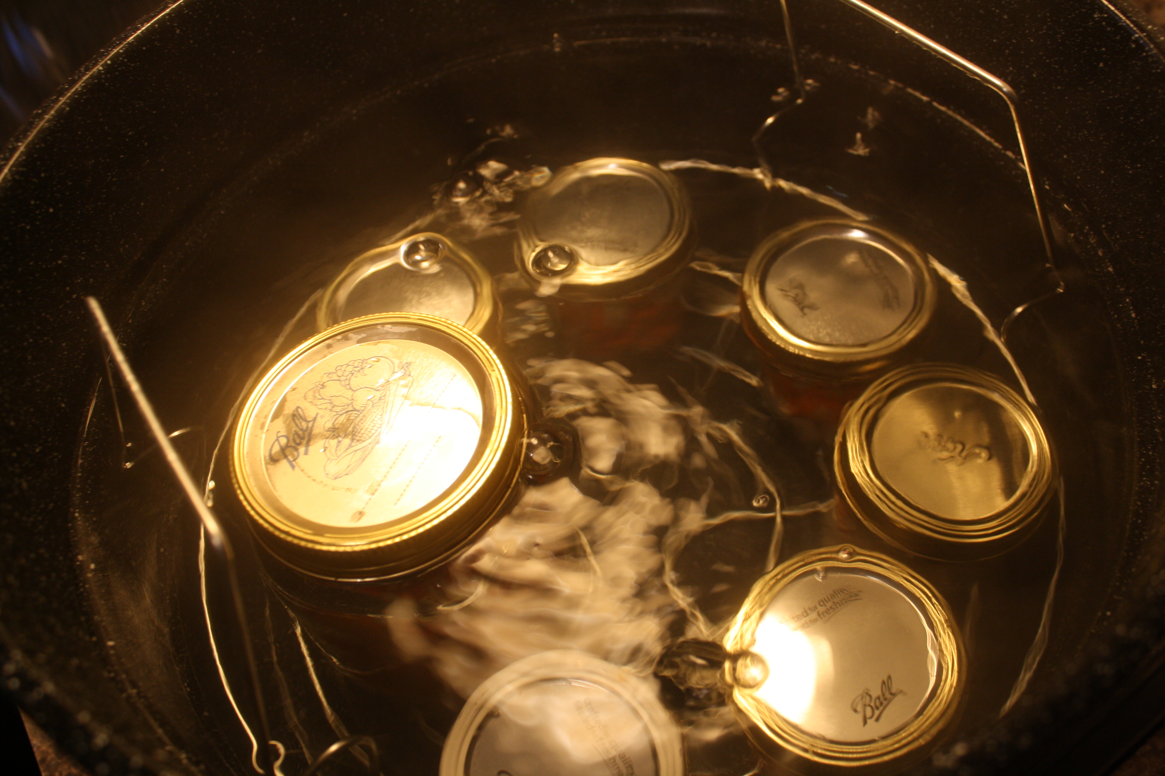 The water should be about 2 inches above the top of the jars (so ignore that big one sticking out). Then took them out for the REALLY exciting part, where you hear the jars suction themselves shut as they cool.