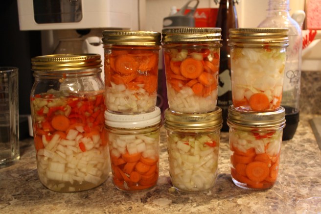 During this time I started sterilizing the jars and lids. Also started boiling the big pot of water for the final sterilization process. Also realized why this is a cold weather activity (I was sweating profusely.)
