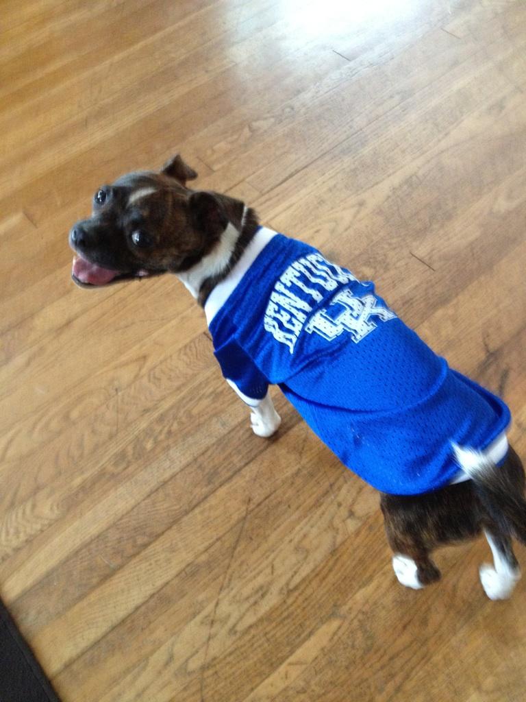 …like Spike got a new football jersey! (because his old one was too small). And he is HAP-PY.