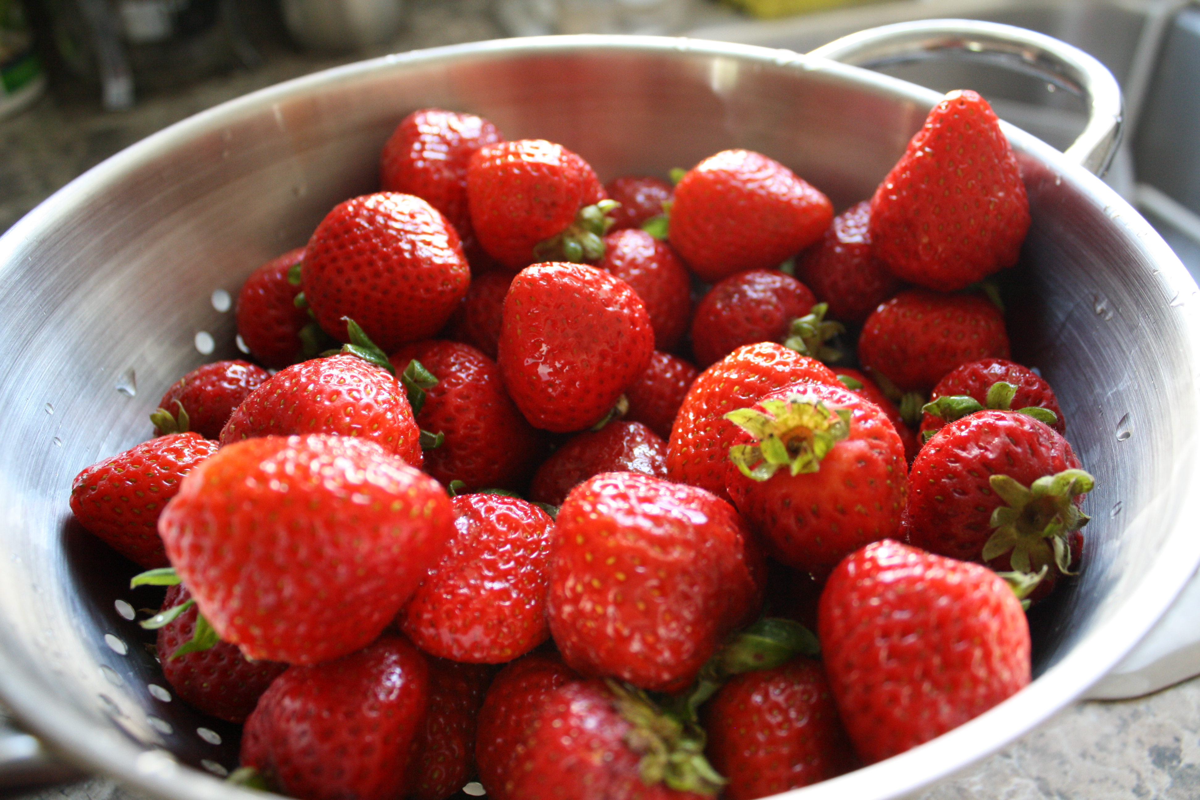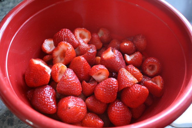 So, full disclosure, these are not our strawberries. Our strawberry bush in the back of the yard suffered the same tininess problem as our raspberries this year. So these came from the farmers market.