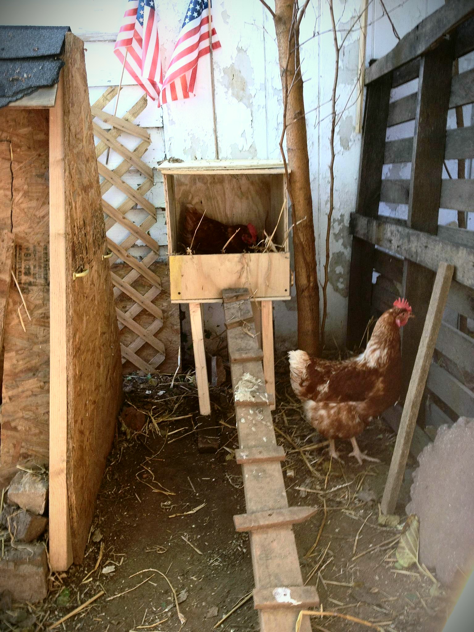 So, attempt #1: build a ramp to place under their butts, slanting down towards the back of the coop, so that when the chickens lay from the perch the egg rolls down where they aren’t really visible and or readily available for eating. Simple.