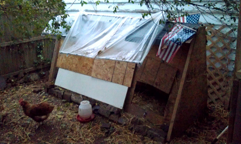 A few days ago, after a week of successes with the new penthouse, I went out back to let the chickens out and found one of them pecking at something inside the coop. At first I thought she was just eating her own turds (weird and gross), but upon further inspection realized that it was actually an egg. With no shell.