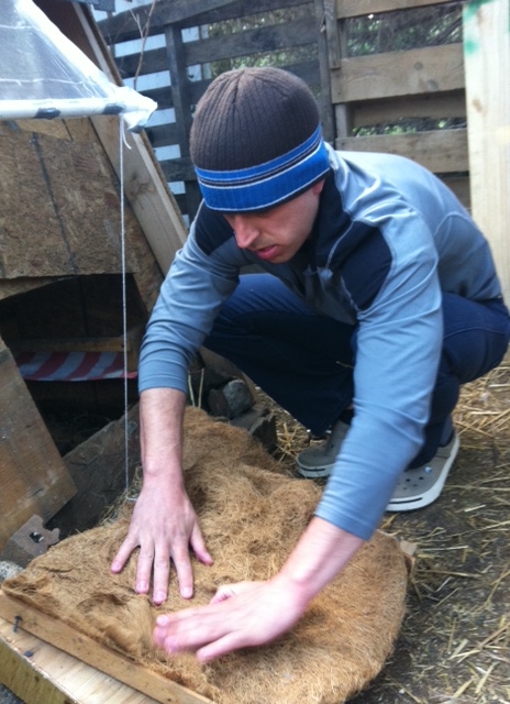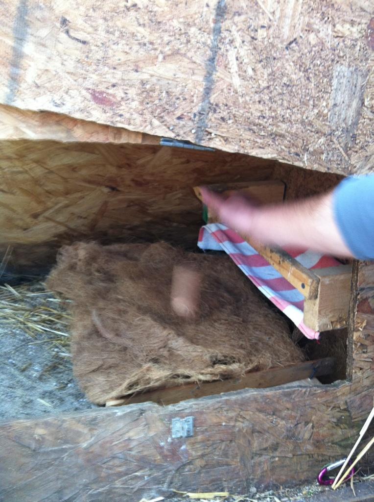 Anyway, Paul found the next best option the he thought the chickens wouldn’t eat: some sort of dried grass/hay like padding. So we padded the ramp…