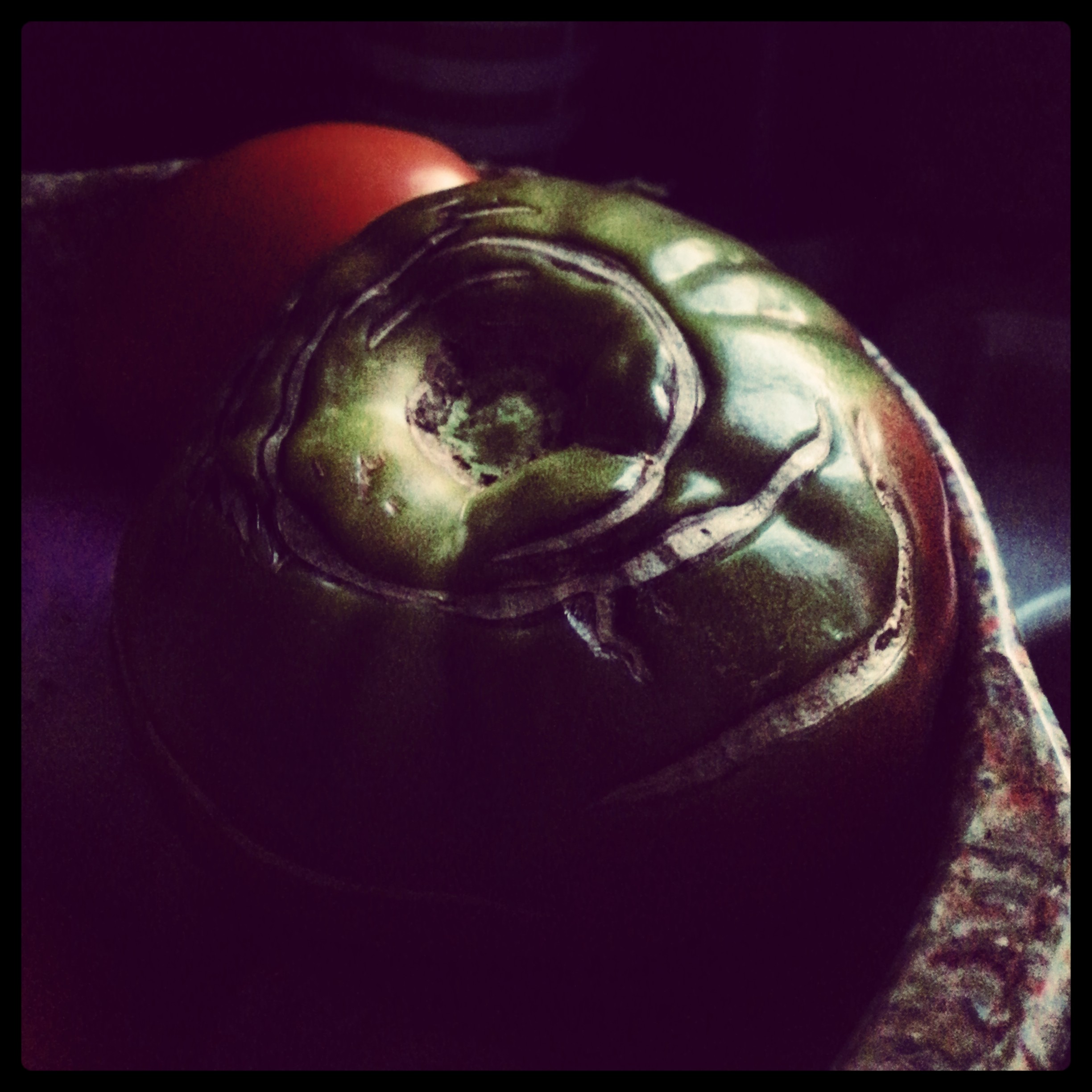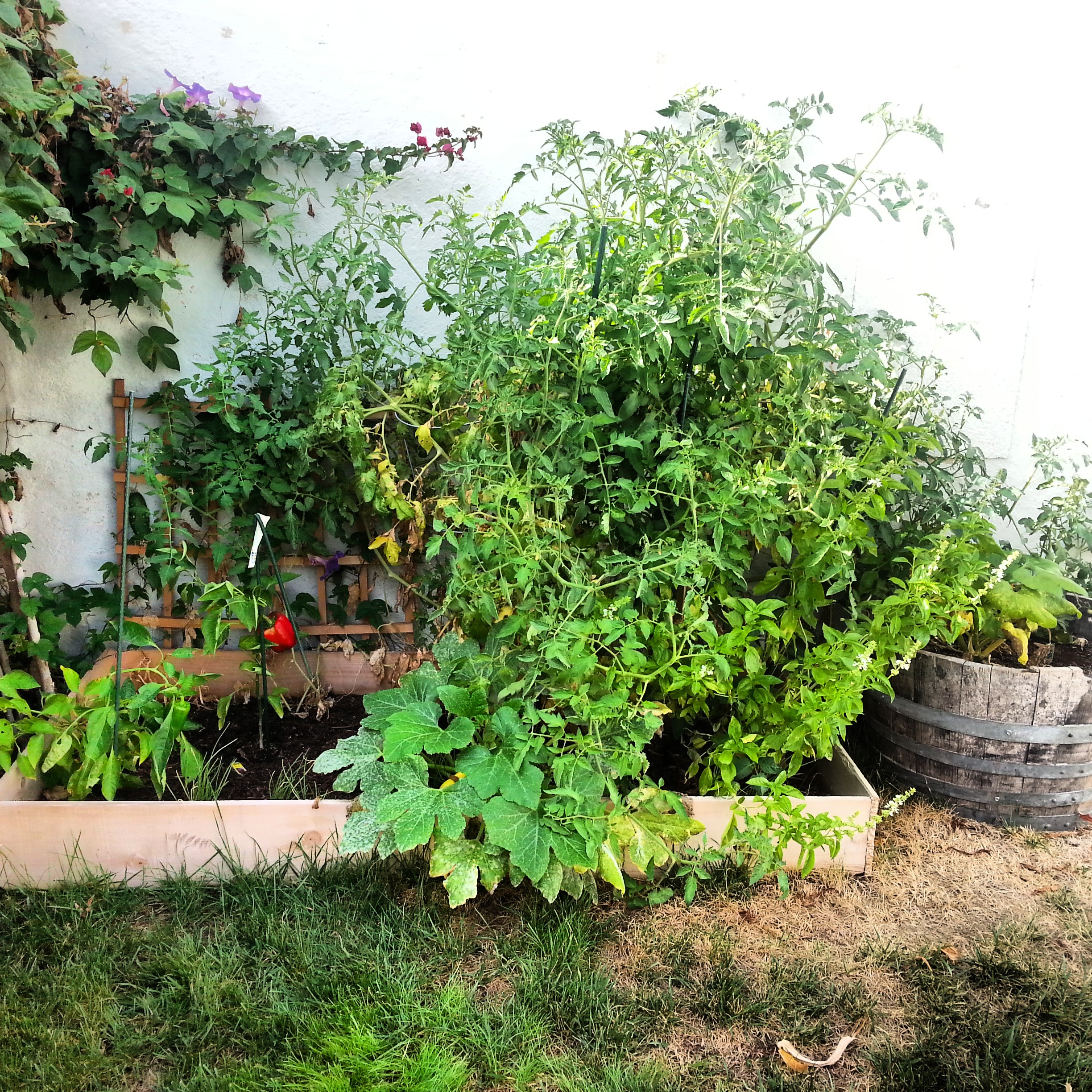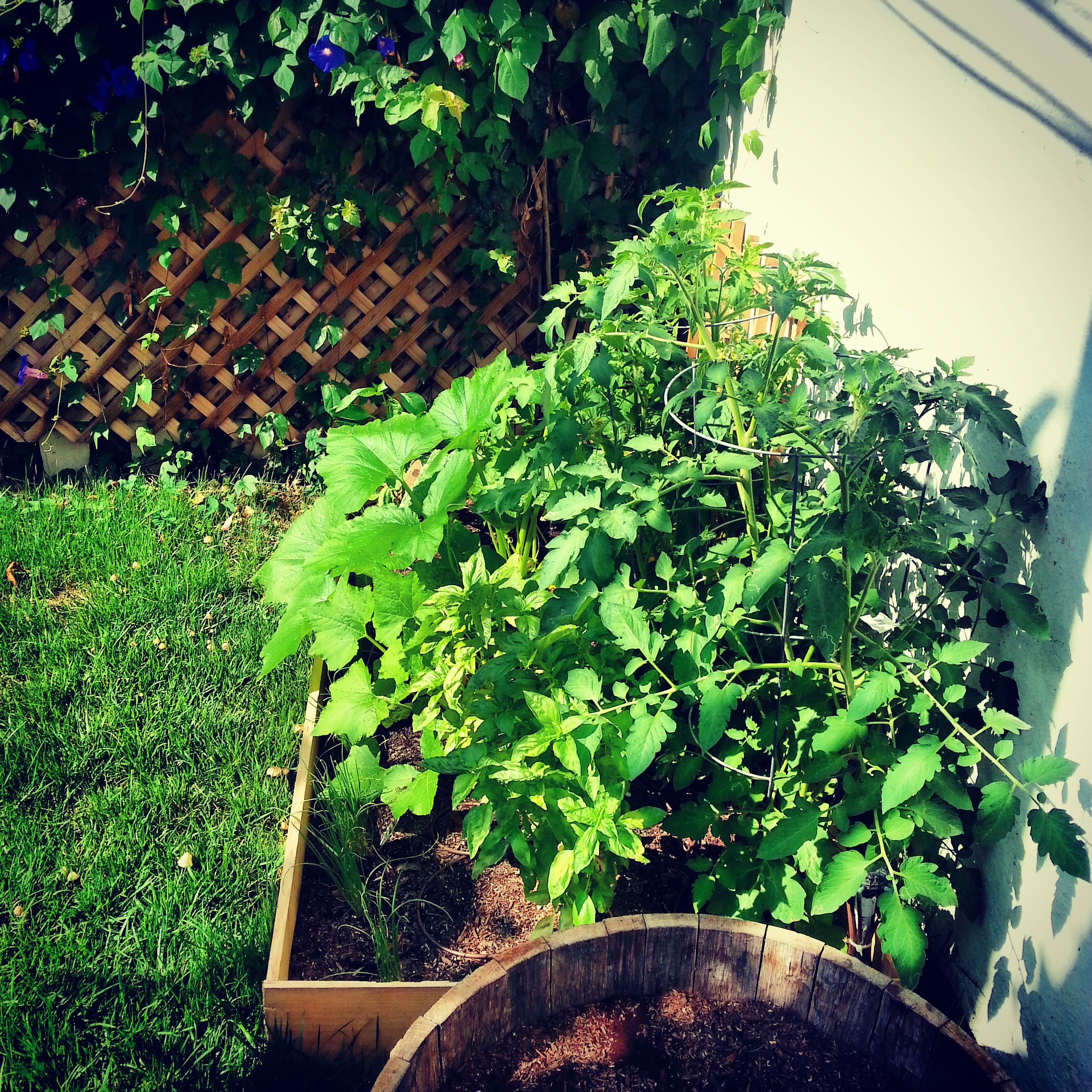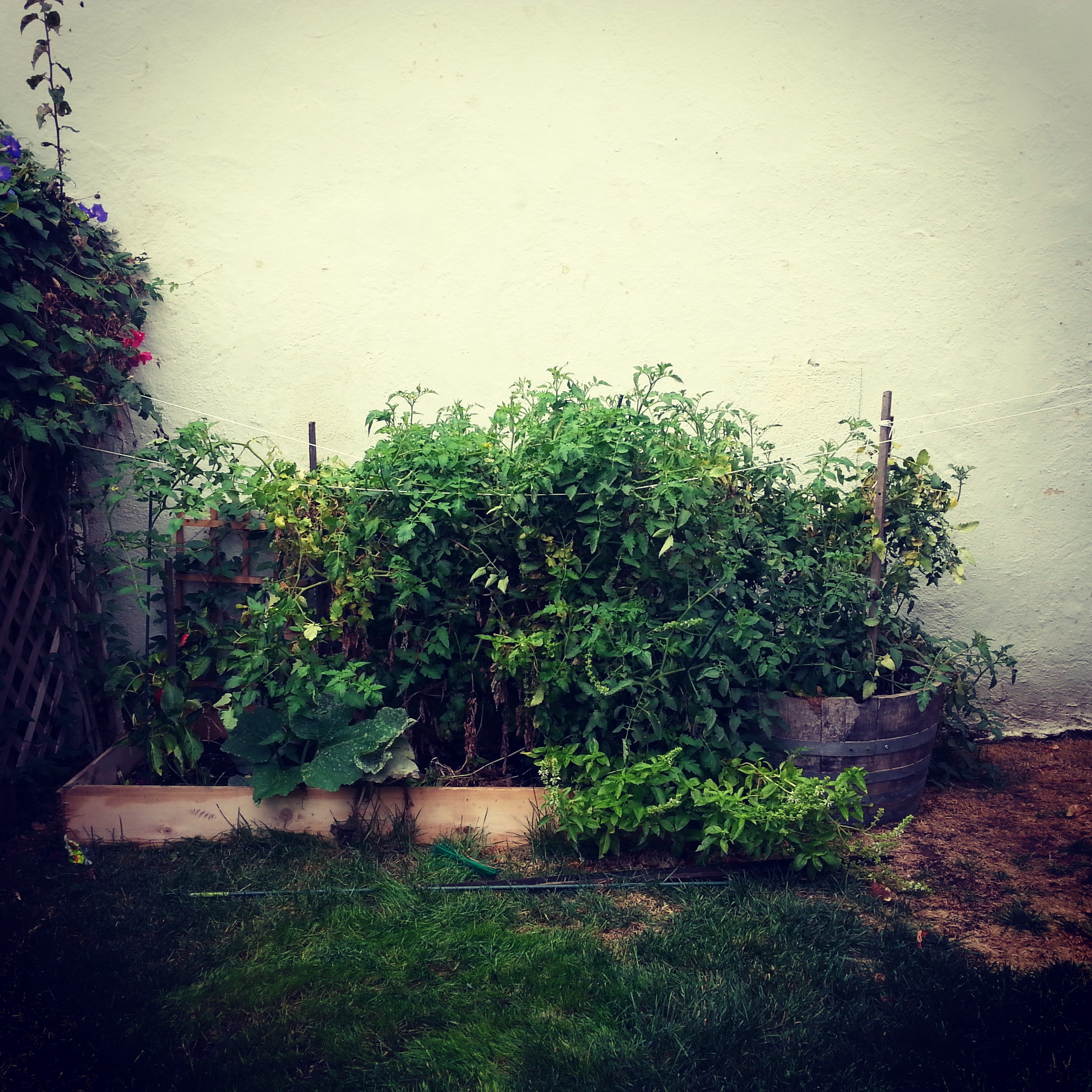 I just don’t even know what to do. The tomatoes are taking over not just the garden but that entire section of yard. That sad little plant you see hanging out of the garden box on the bottom right? Those are our (previously huge) basil plants. The planter to the right has also been taken over by tomato vines.