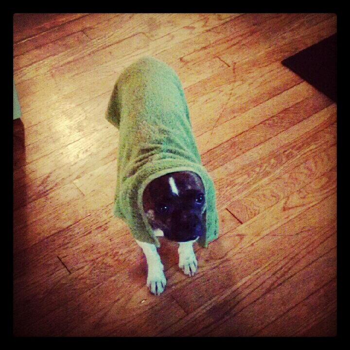 So two days ago it was extra hot and Spike was definitely suffering, so I draped a wet towel over him to cool him off. Usually when we try to dry him off with a towel he freaks out and shakes it and runs around the house with it in his mouth. But today, he left it on his back and walked around the house with it on for like 10 minutes.