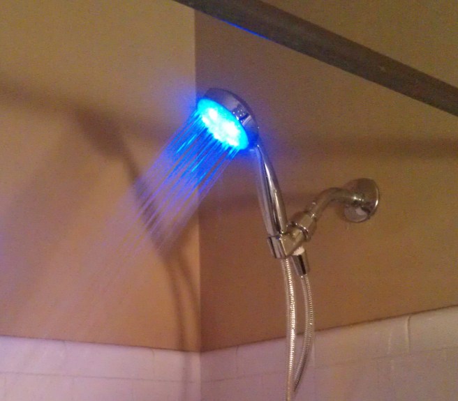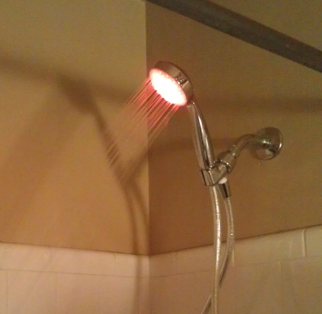 Zing! Blinking color-changing disco shower in the guest room. I did not know these existed or this would have happened much sooner. The color correlates with the water temperature. Double win.