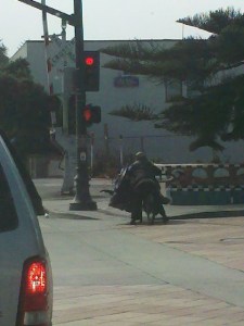 A homeless fellow riding his bike down State Street carrying his life on his handlebars, which included (but was not limited to): clothing, bedding, bags of cans, a boogie board, and an extra bike. Just in case. This guy is ready for anything.