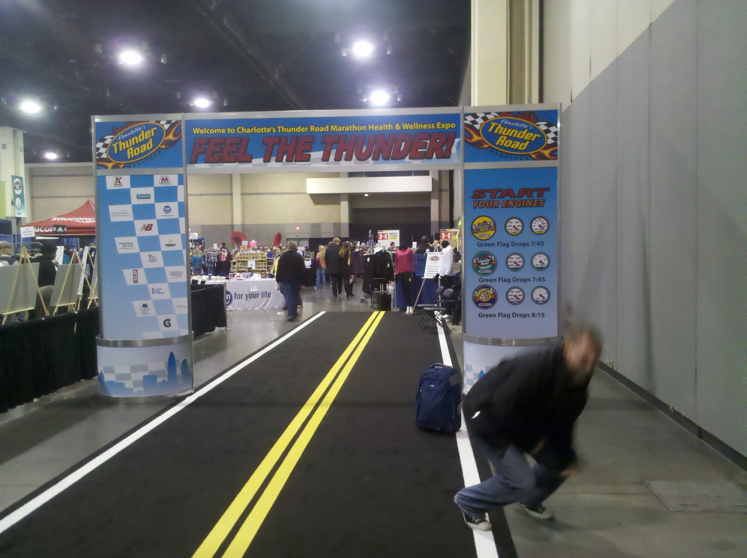 Colleague and I traveled down to Charlotte, NC…home of Bank of America, bars that don’t open on the weekends, the NASCAR Hall of Fame, and Carolina barbecue void…to run our half marathon this past weekend. After hitting up the expo (above) and carbo-loading the night before (beer, fried pickles with ranch, and gravy cheese fries) we woke up the next morning rarin’ to go…and promptly missed the start of the race. Along with about 1,000 other people. But we followed the mad crush and it eventually carried us across the starting line at the very rear of the group. We were off!
