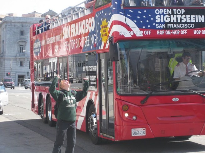 Apparently she’d been hanging out at the bar for a while. But to be honest, it was probably better than any of us could do at that point. We finished up our drinks and hit the road again, where we saw…another double decker red bus. Why these things run through the Tenderloin I will never understand. This meant only one thing: