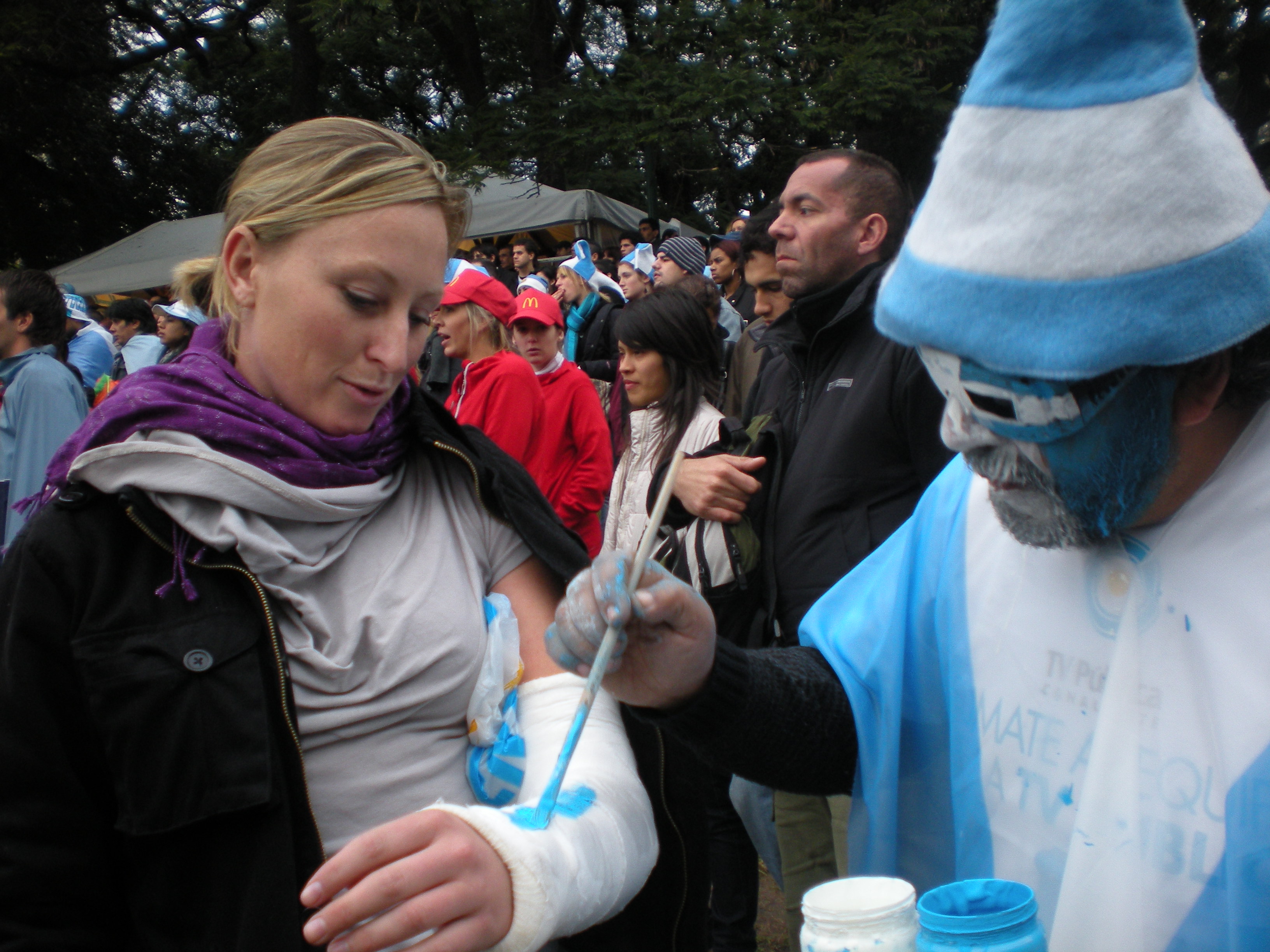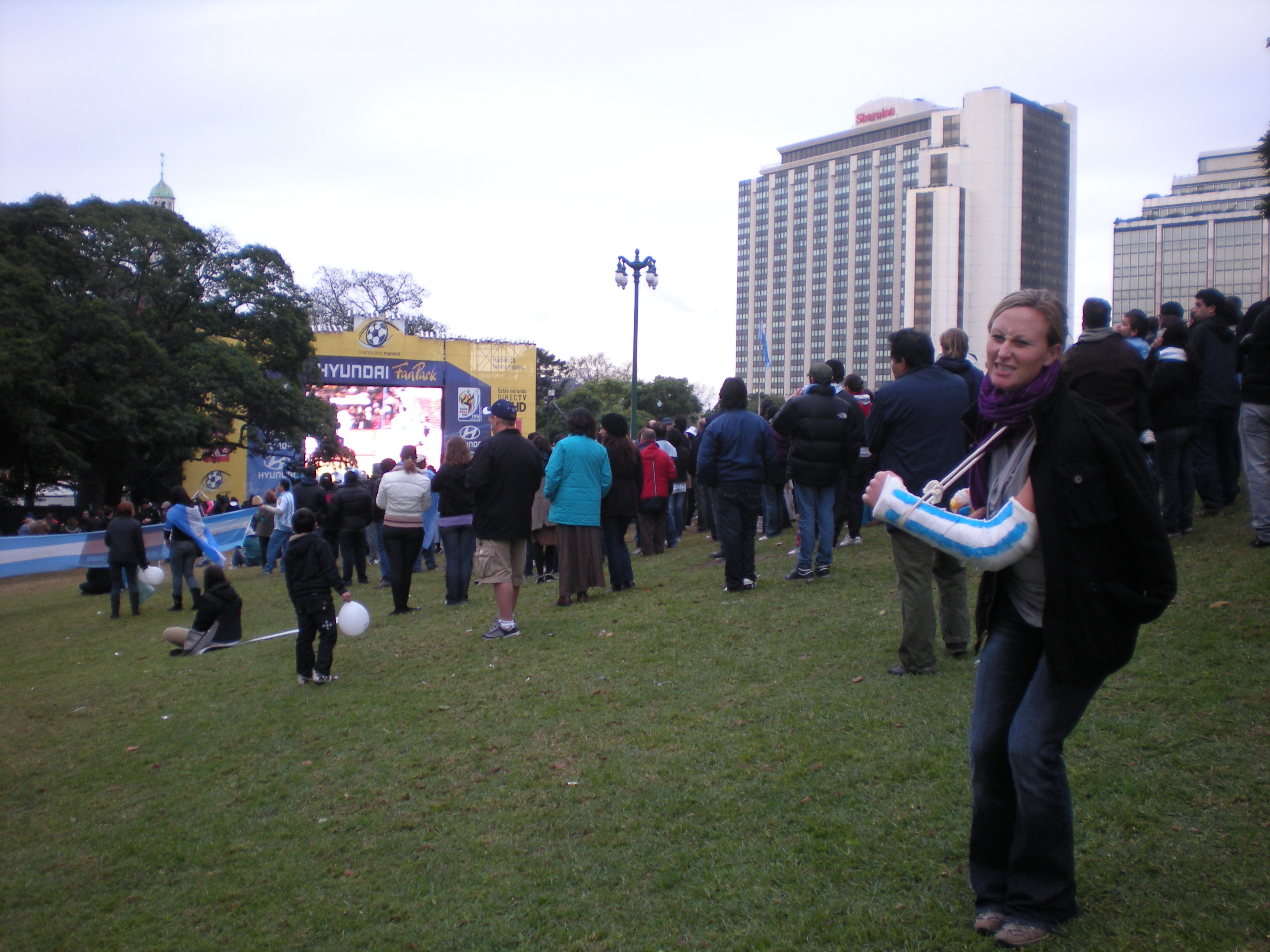 We were in Chicago and made the stupid mistake of deciding to watch the second half of the game in the cafe on the first floor of our hotel instead of in our room. So we take the elevator down, me with my blue and white striped cast blazing openly, and walk in to a big room…full of Germans. Most with face paint. I get booed all the way to my standing-room-only corner, where I spent the next 45 minutes listening to “JAH JAH JAH JAH JAH!!!!!” and German songs while Argentina completely lost it. I exited the room at the end of the game to a chorus of “Auf wiedersehen!”s.